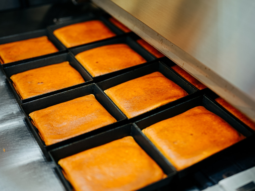 擂潰士が仕上げた生地を、焼成機で一気に焼き上げます。